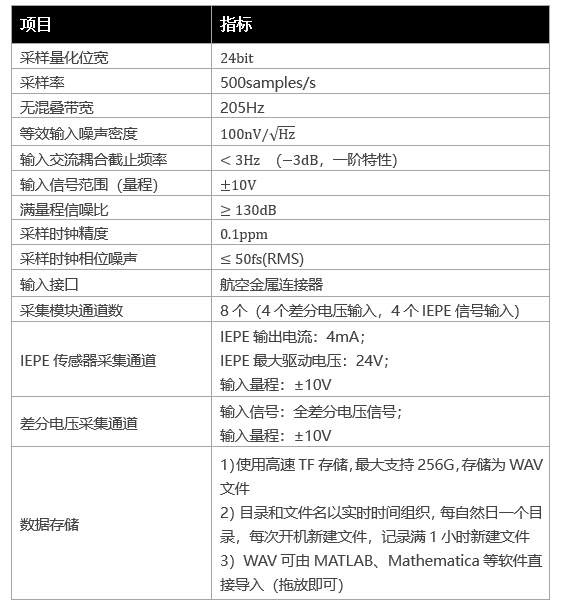 8通道采集卡的采样率为500Hz,其中4个通道用于差分输入模拟电压信号采集,输入量程为±10V,另外4个通道用于IEPE(ICP)传感器信号采集,输入量程为±10V。
